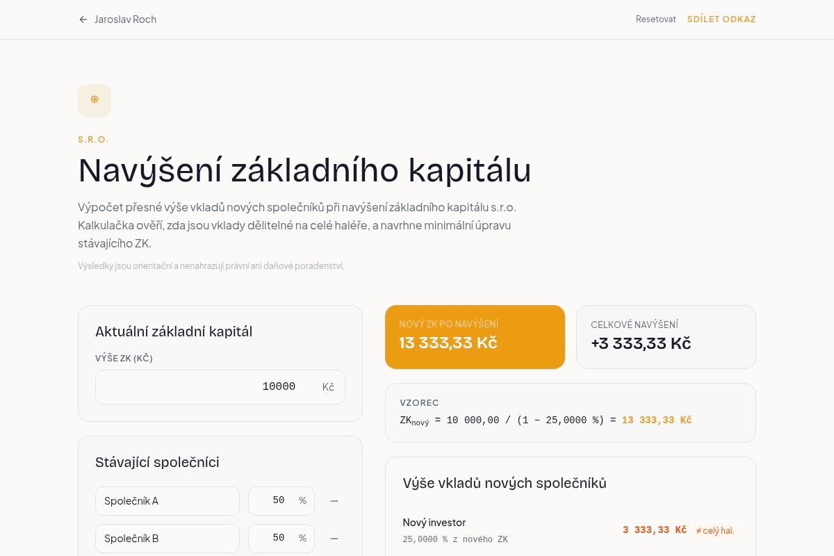 Výpočet přesné výše vkladů nových společníků při navýšení ZK s.r.o. Ověření haléřové přesnosti a návrh minimální úpravy.